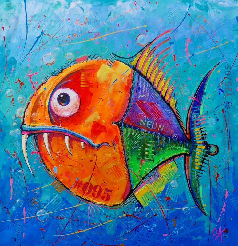 Sumergete en un mundo submarino expresionista y caricaturesco donde peces de colores intensos cobran vida y personalidad propia, explorando rutas de luz y emoción bajo el agua. Una alegre colección de acrílicos originales creados para divertir.