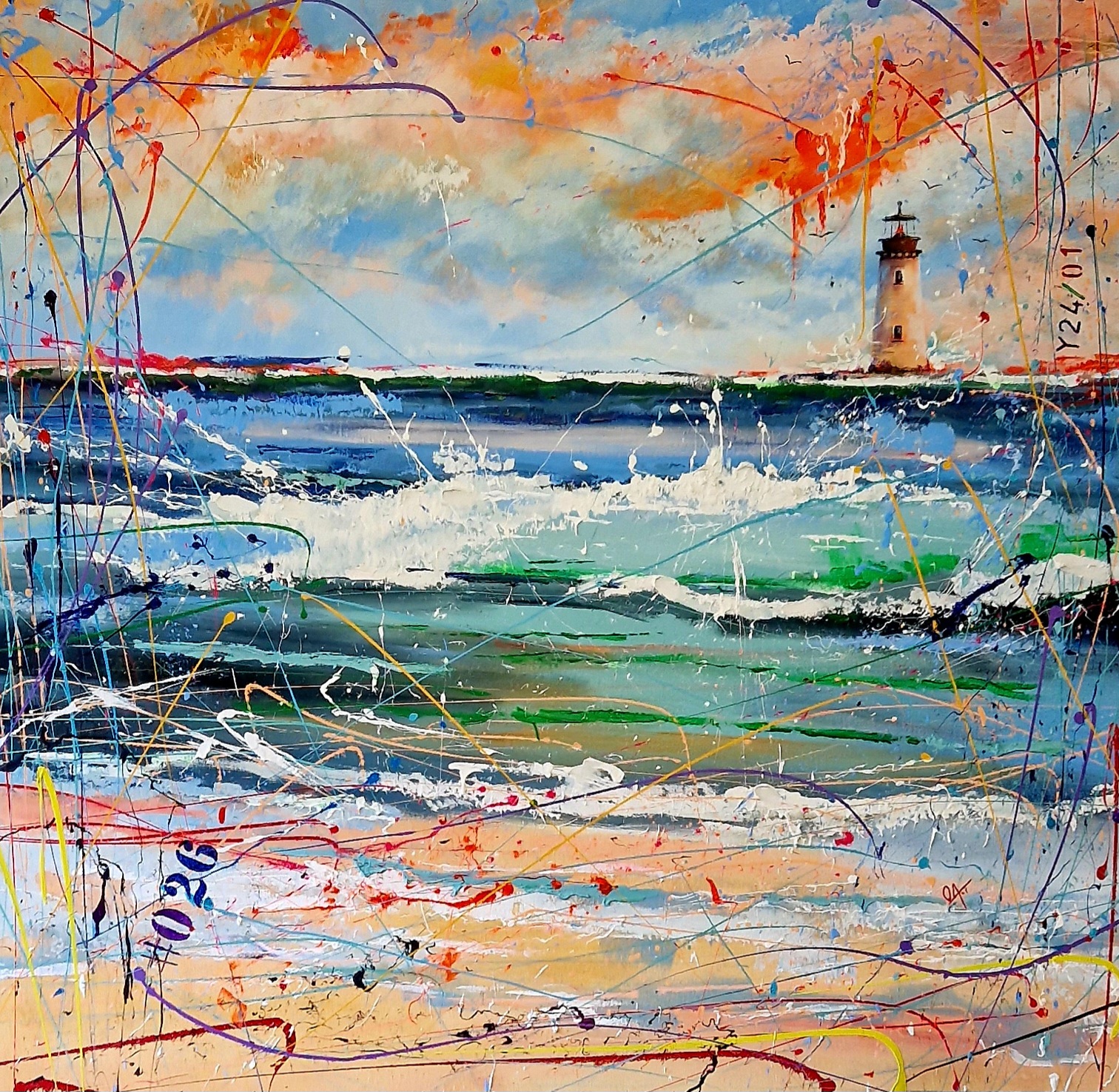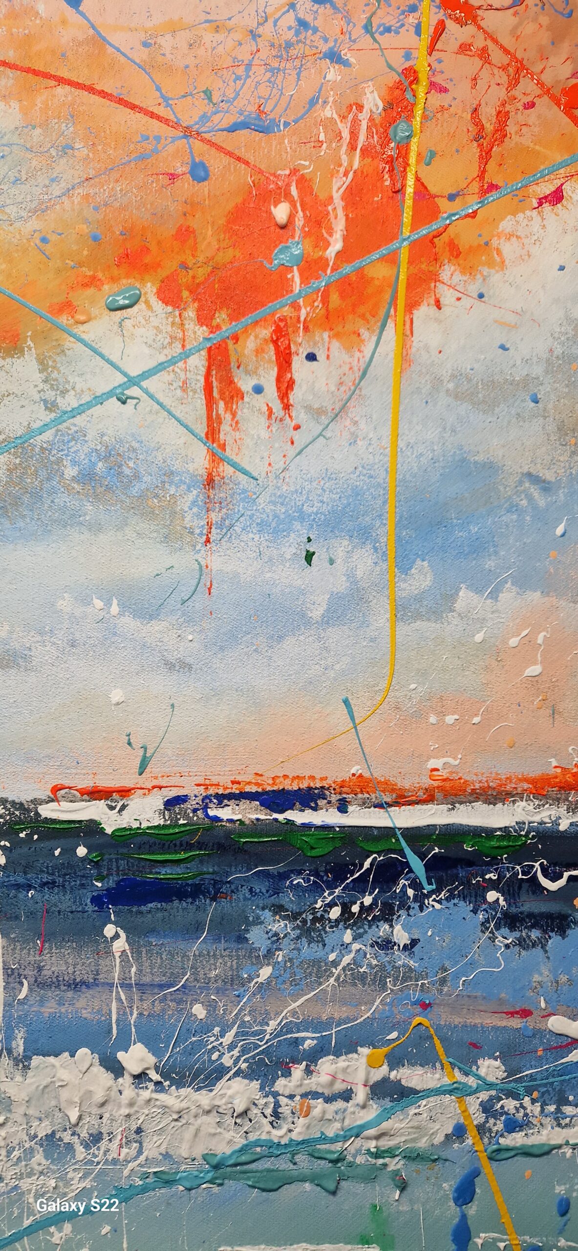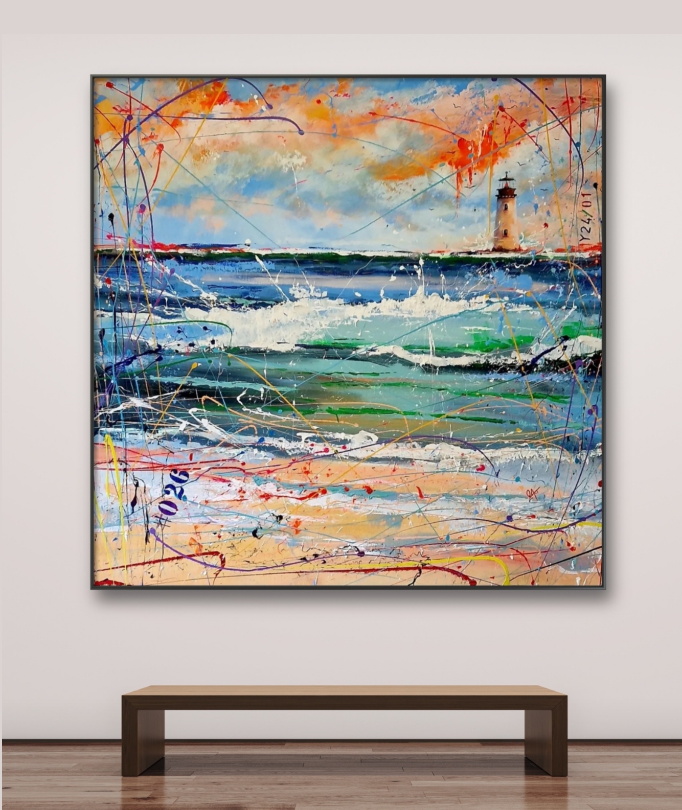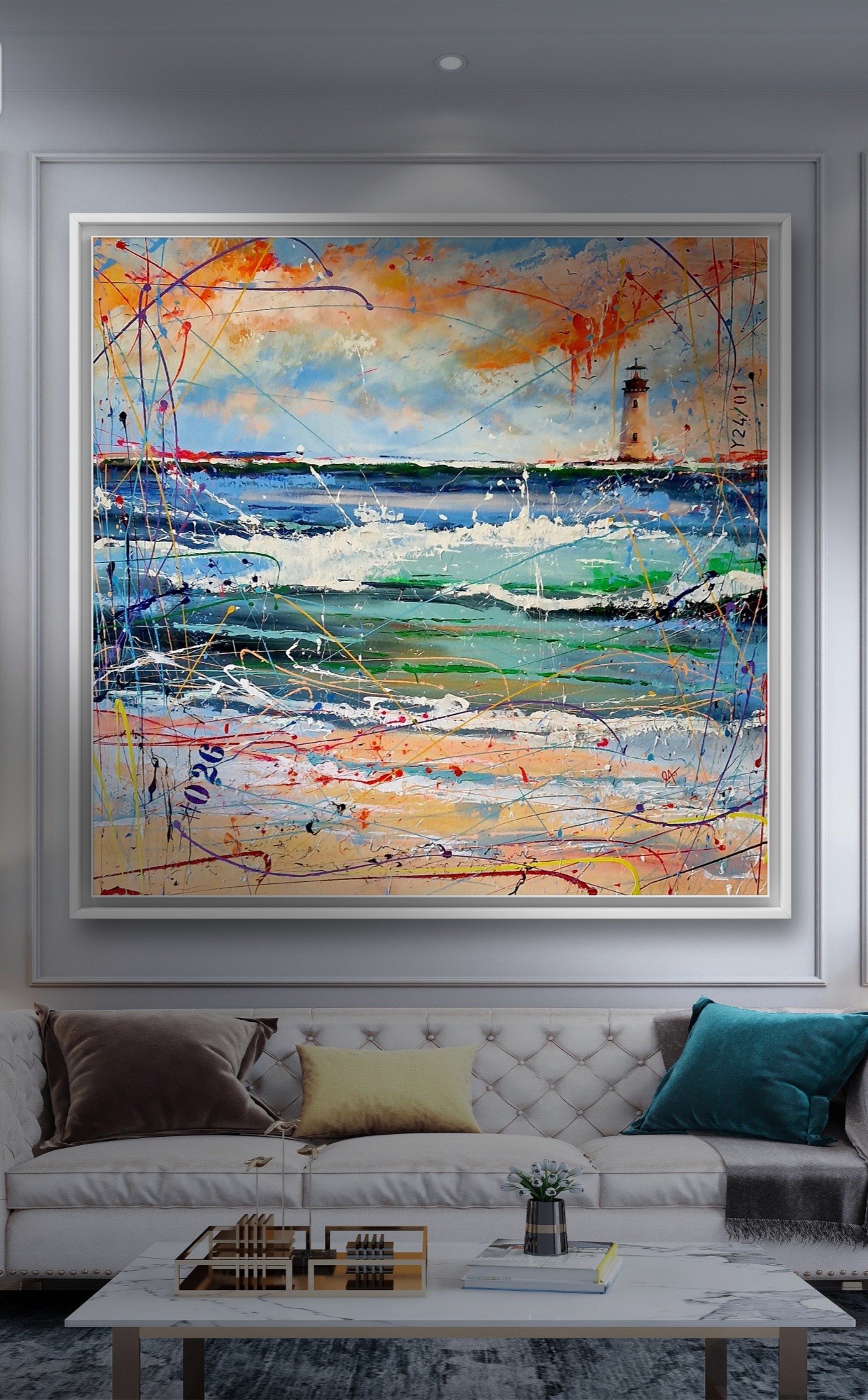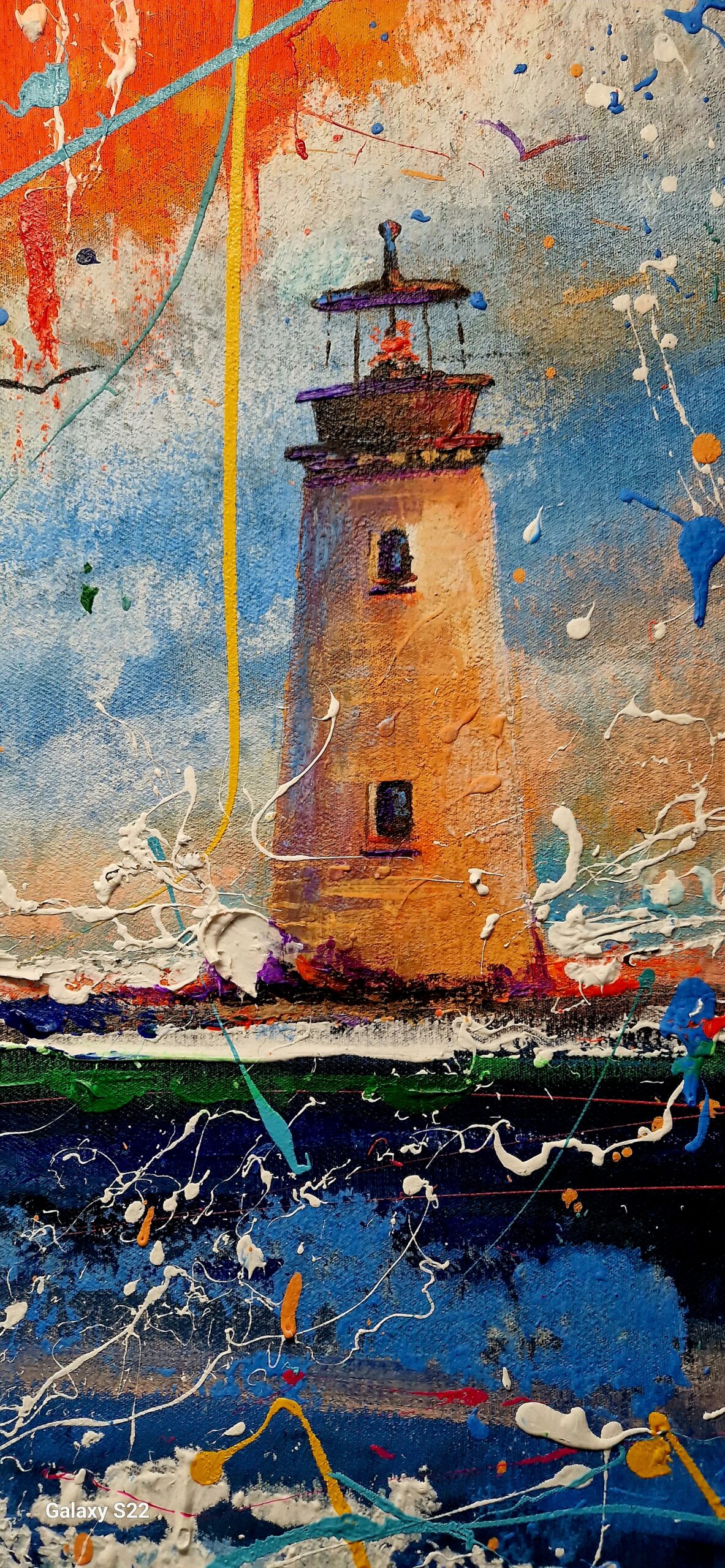 El faro, al fondo, se erige como guardián silencioso, símbolo de guía y esperanza, permaneciendo firme mientras todo fluye. El cielo en llamas anuncia un nuevo amanecer, prometiendo que cada día puede renacer desde el color y la emoción. Mis pinceladas libres y salpicadas reflejan la imprevisibilidad del mar: cambiante, indomable y profundamente bello, capaz de transmitir su energía a quien observa.