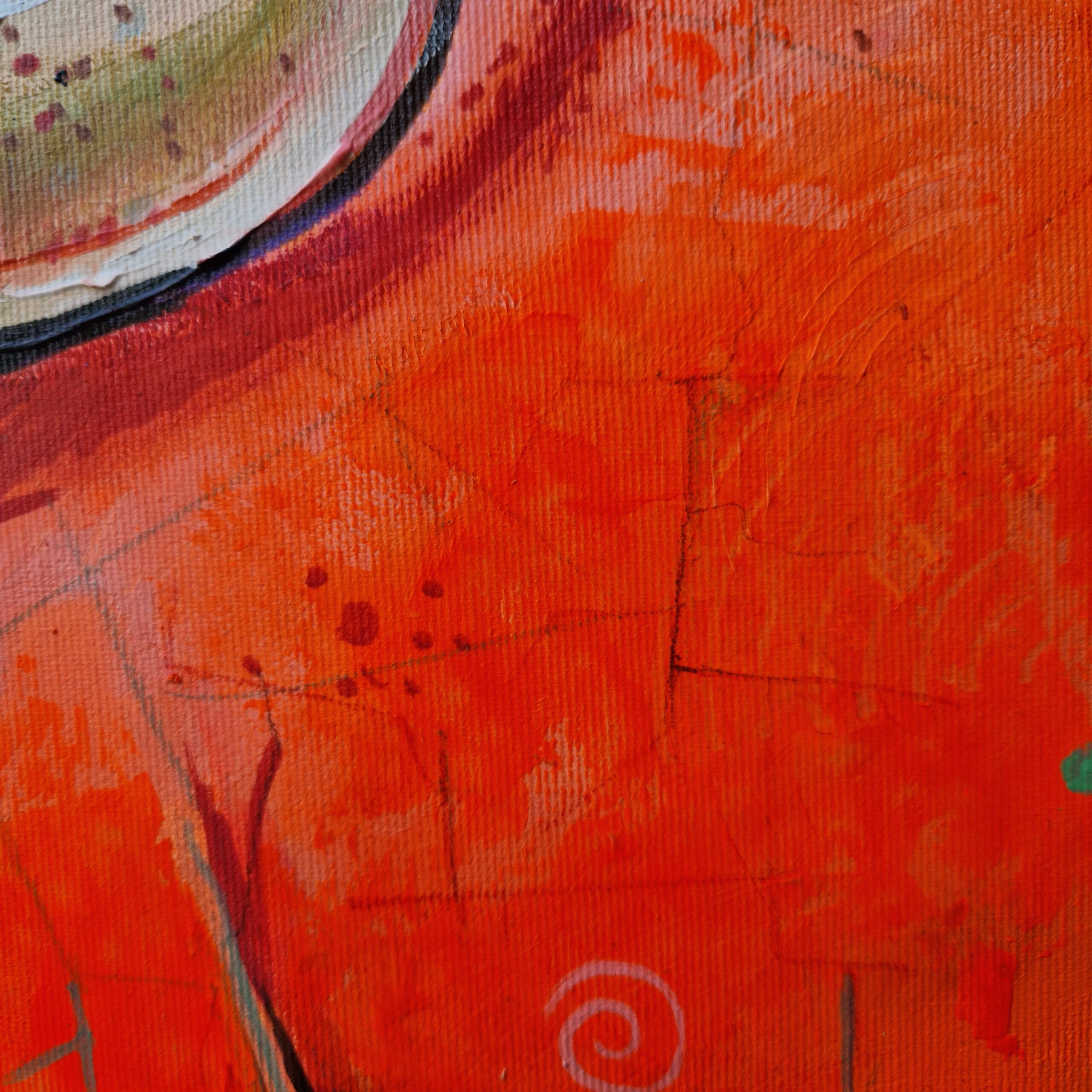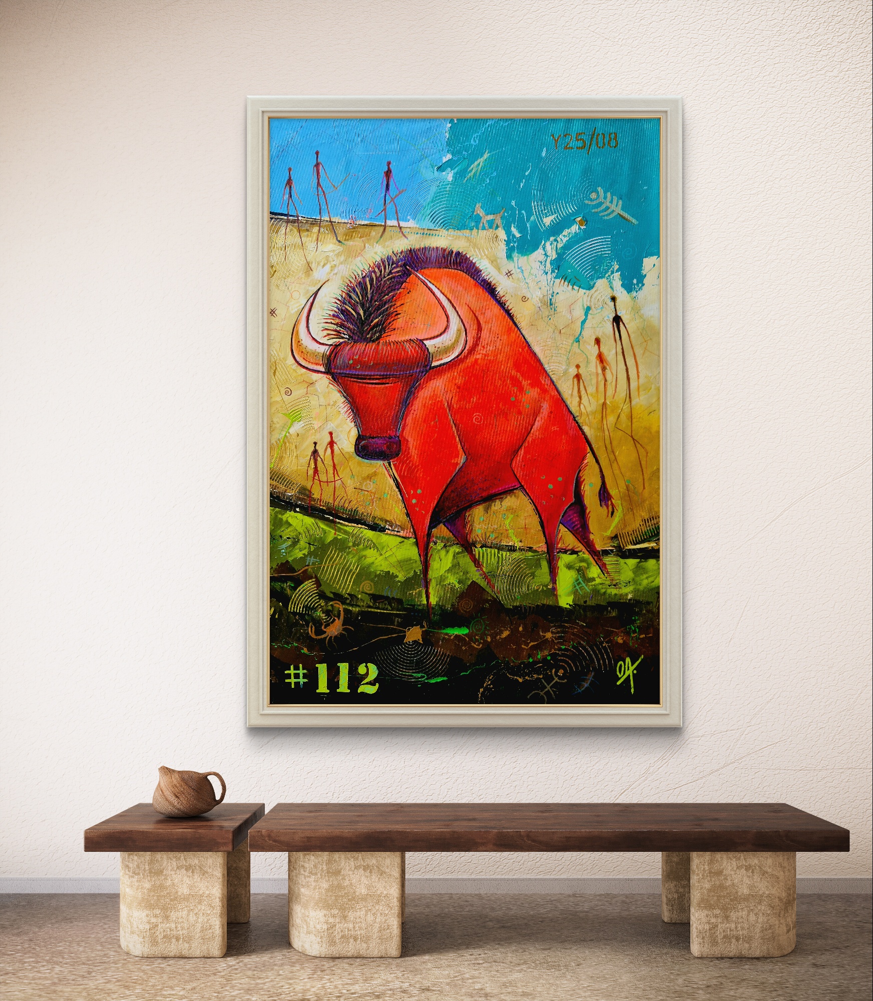 El uso del rojo profundo en la obra no es casual. Este color vibrante y visceral refleja la fuerza del bisonte, la sangre y la vida que atraviesan la memoria de los pueblos que lo veneraron. Para mí, el rojo funciona como hilo conductor entre lo sagrado y lo terrenal, evocando una espiritualidad ancestral que permanece vigente. Cada matiz y cada textura buscan generar una conexión emocional directa con quien observa la pieza.