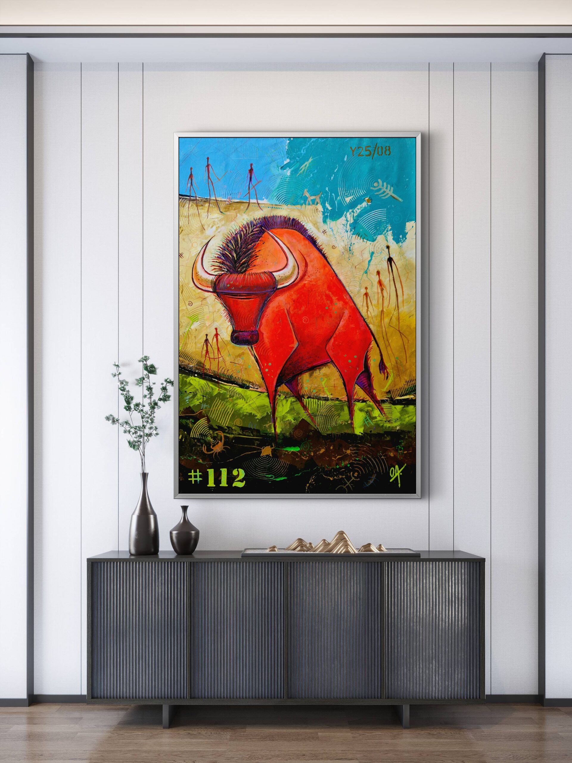 En Guardian of the Plains exploro la fusión entre historia ancestral y visión contemporánea. Represento al bisonte, símbolo de las vastas llanuras, como un centinela que conecta lo primitivo y lo moderno. Su figura imponente y sus formas angulares buscan comunicar fortaleza y presencia, recordando la resistencia de los pueblos originarios frente al paso del tiempo. Cada trazo está pensado para transmitir esa dualidad, donde tradición y contemporaneidad conviven en un mismo espacio visual.