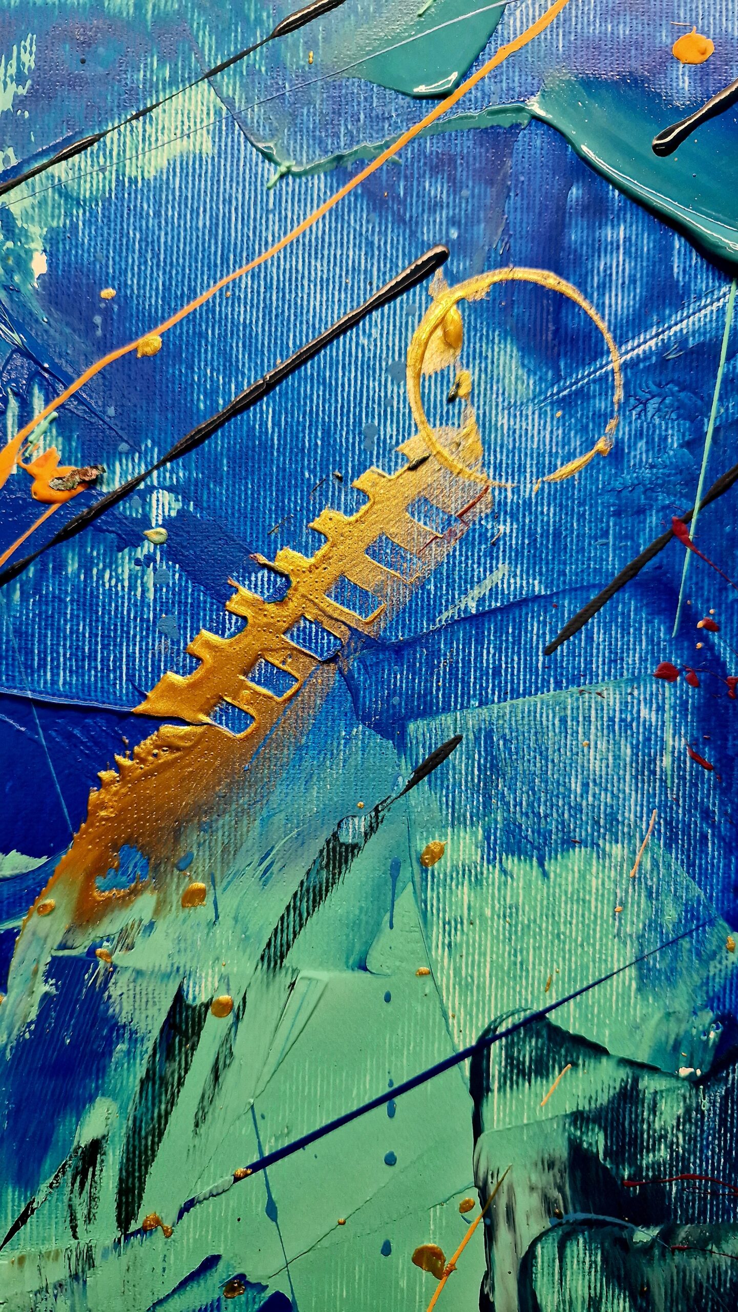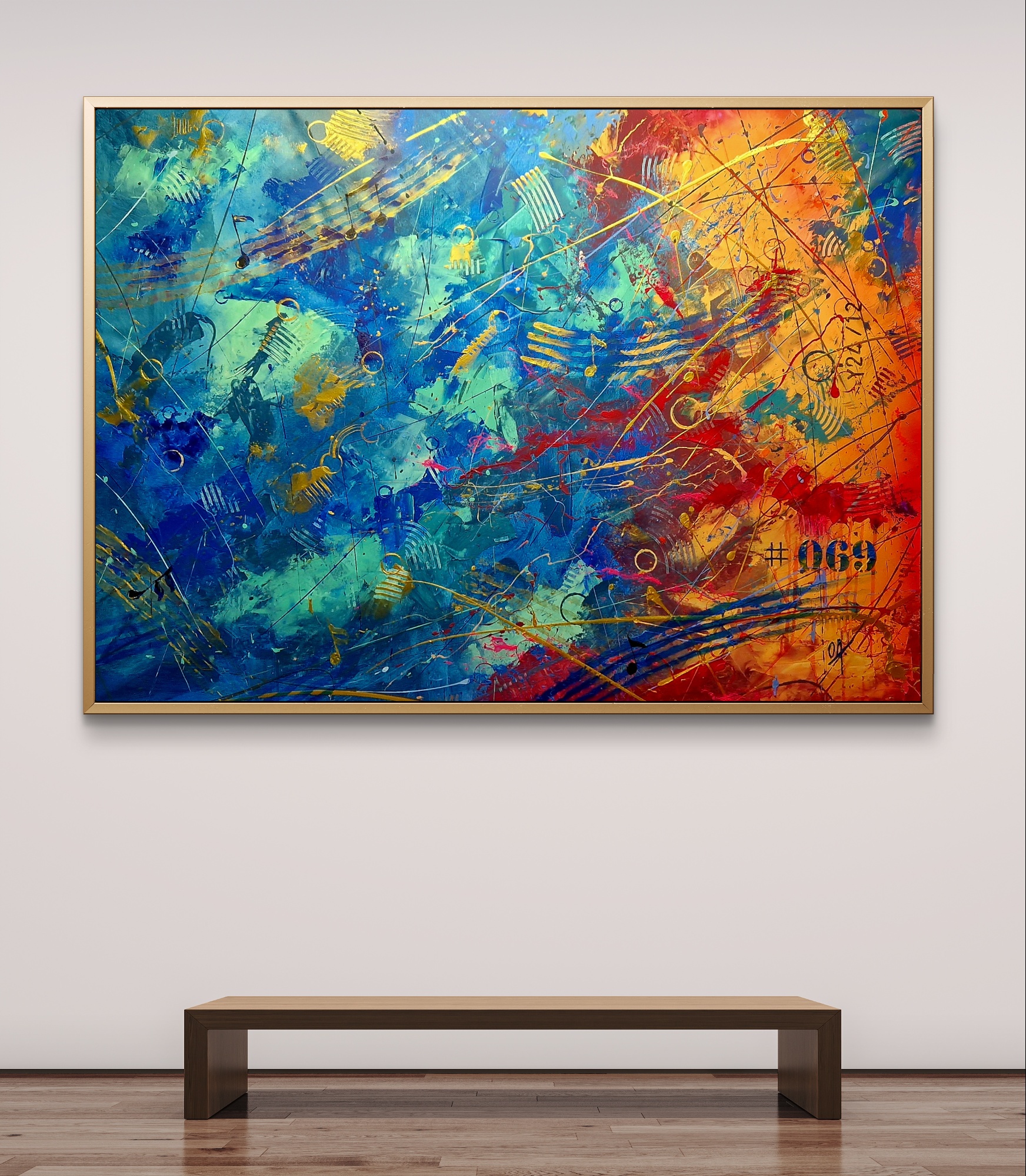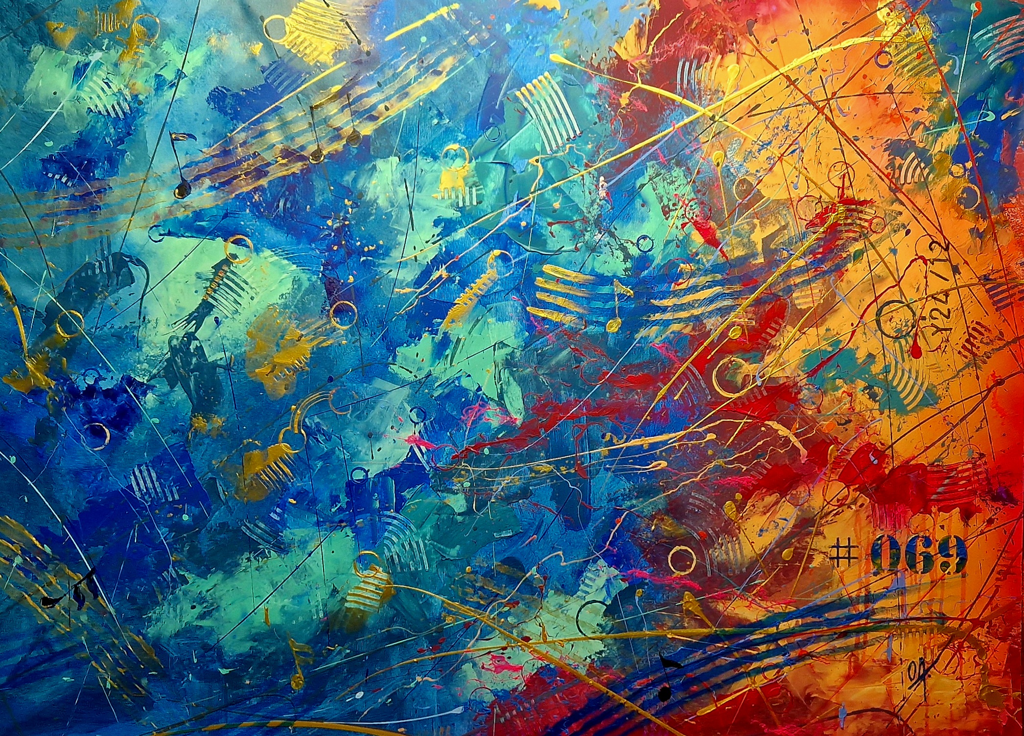 Fusión de música y pintura: azules intensos y destellos dorados vibran como un puente energético entre sonido, emoción y creación.