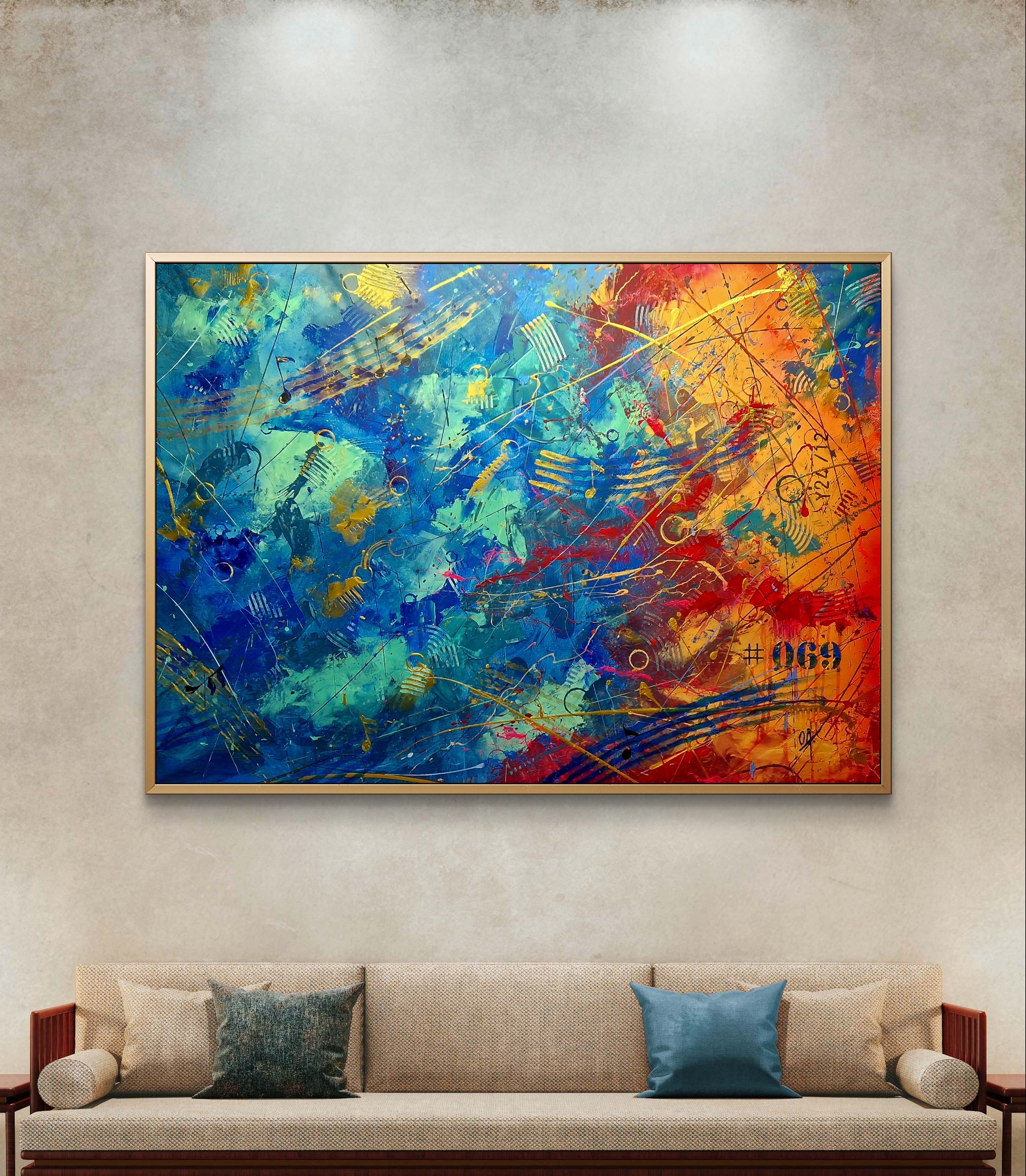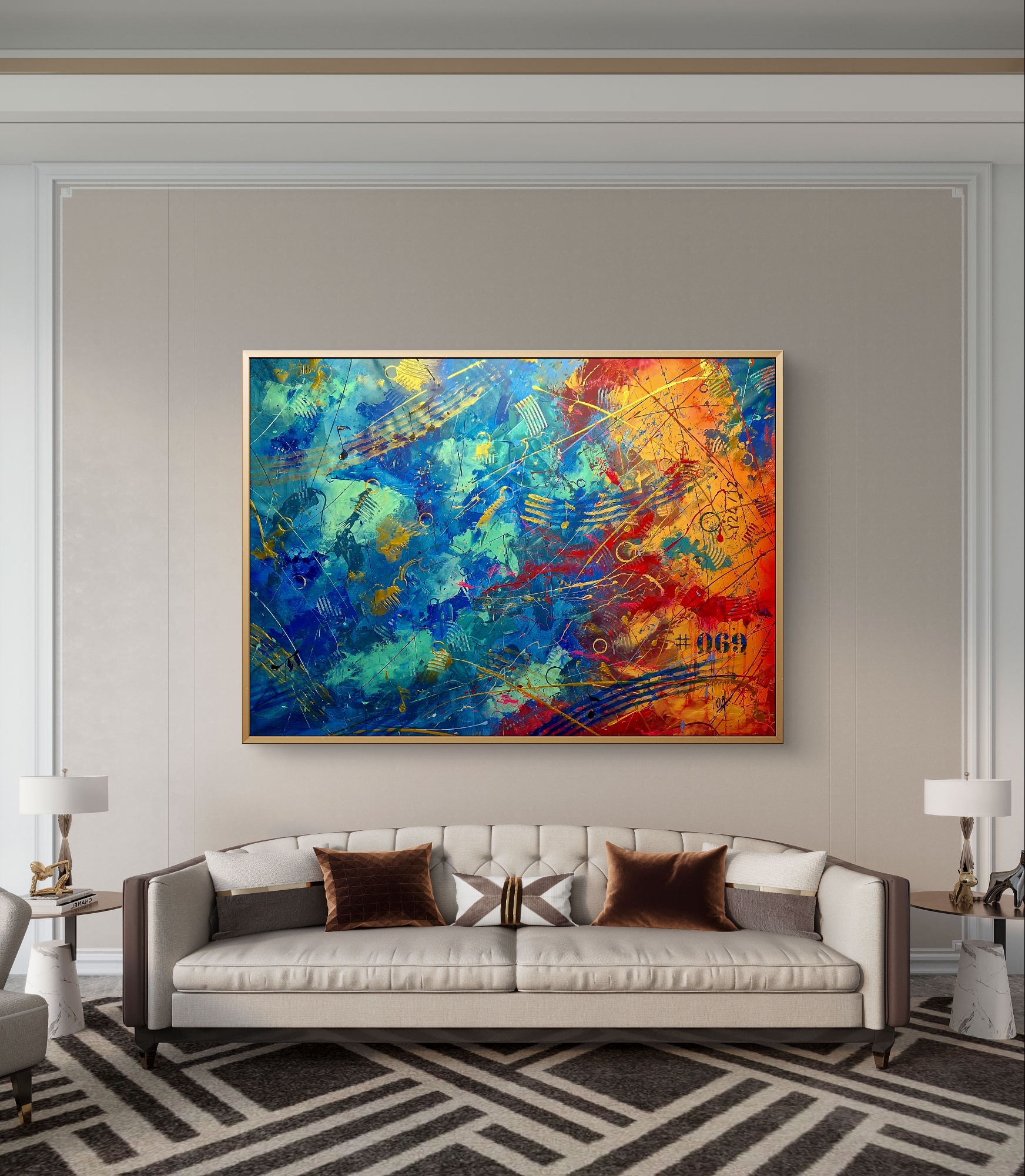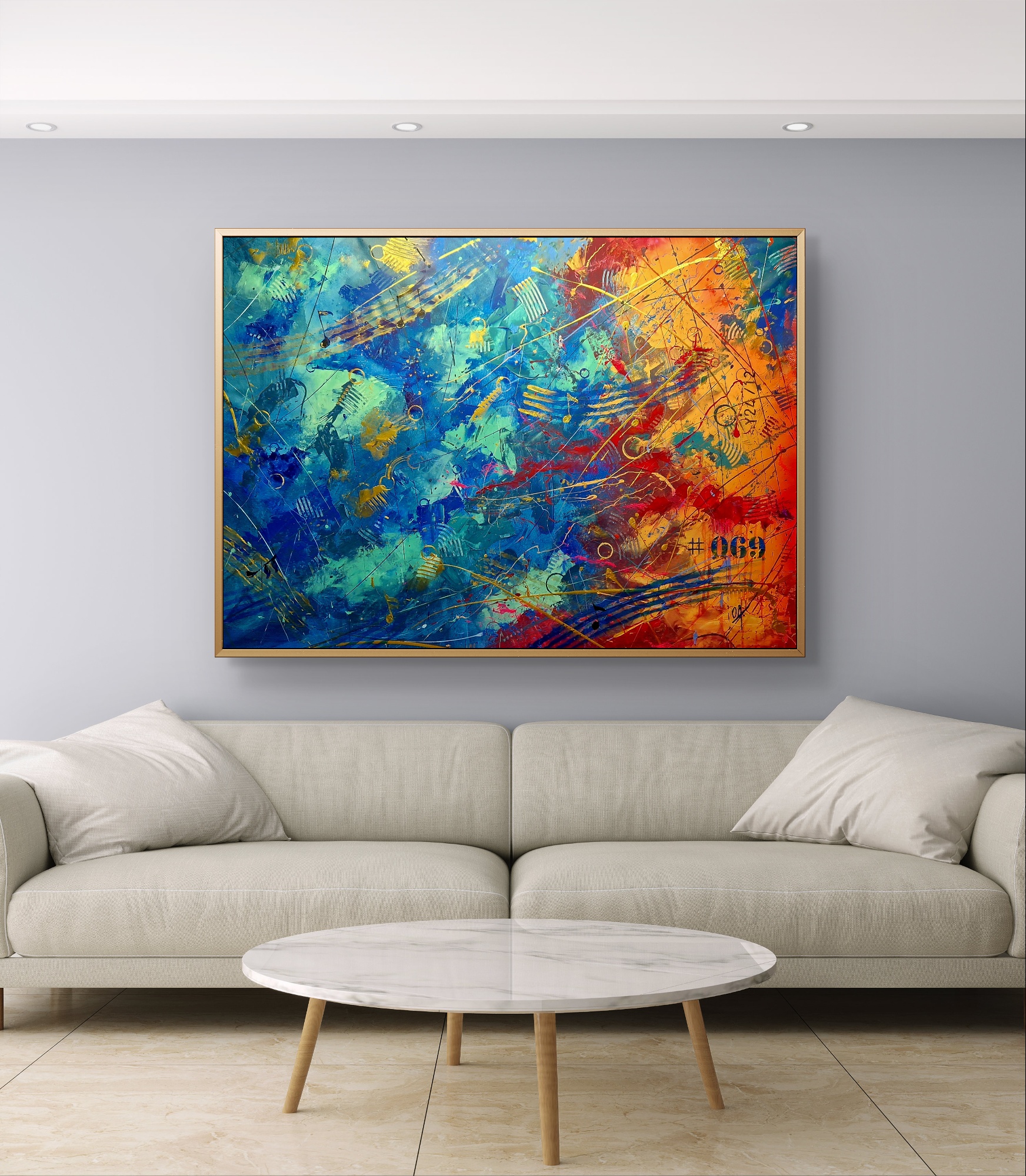 Fusión de música y pintura: azules intensos y destellos dorados vibran como un puente energético entre sonido, emoción y creación.