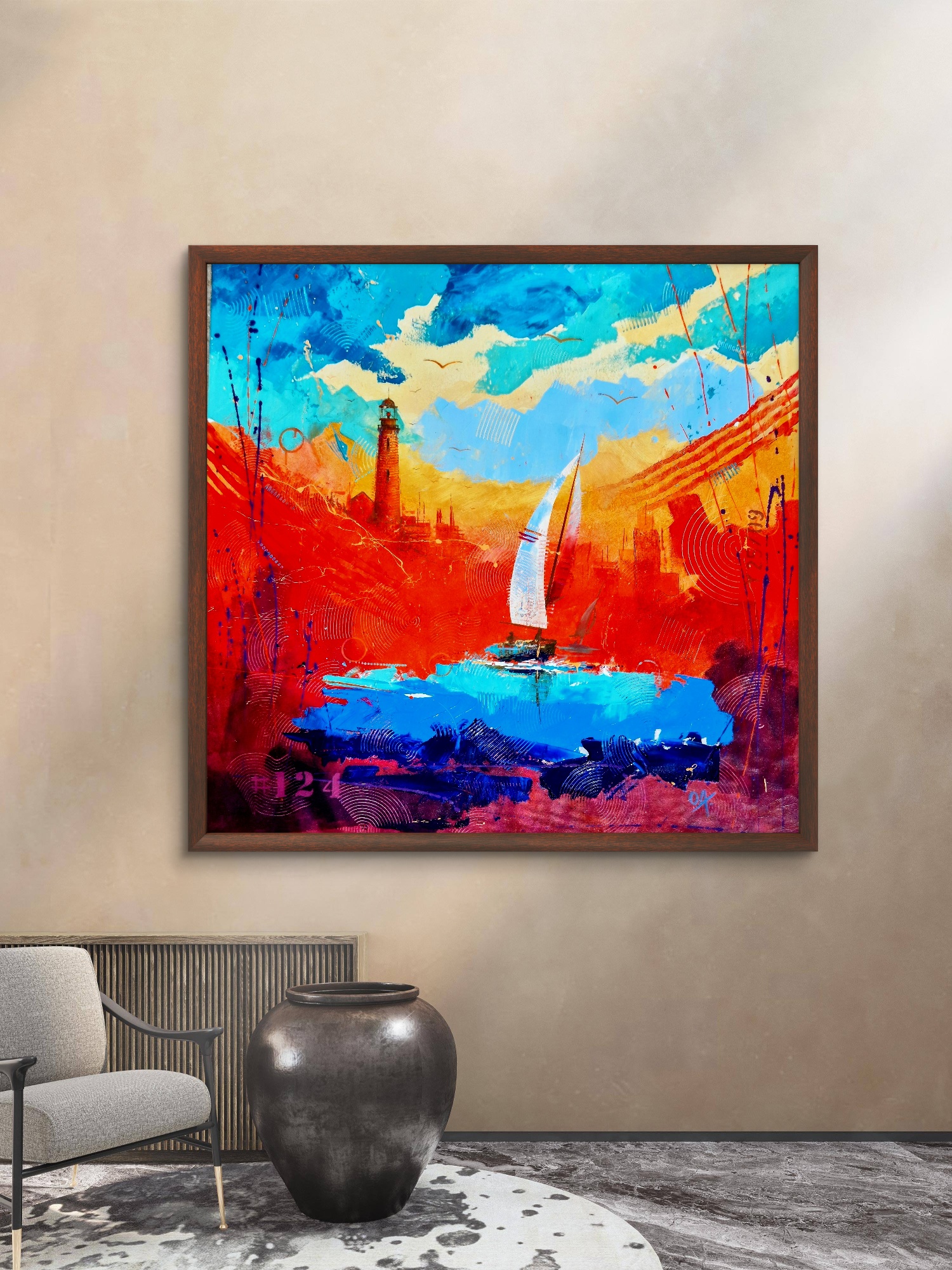 En esta obra permito que el color y la luz se fundan en un diálogo entre calidez y libertad. Quise capturar la intensidad de los atardeceres mediterráneos que siempre me han acompañado: esos momentos en que el horizonte arde en tonos naranjas y rojos, mientras el mar, casi eléctrico, refleja los últimos destellos del día. El velero simboliza mi viaje interior, una búsqueda constante, una forma de navegar entre emoción y memoria.